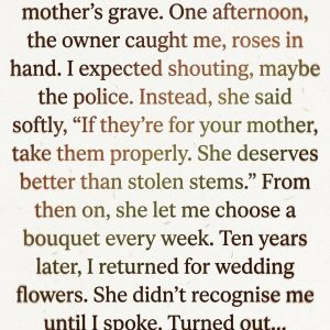 At twelve, I secretly stole flowers to place on my mother’s grave, believing no one noticed my quiet act of love. Ten years later, I returned as a bride to honor her memory again—only for the florist to reveal a hidden truth about those flowers that changed everything I thought I knew.