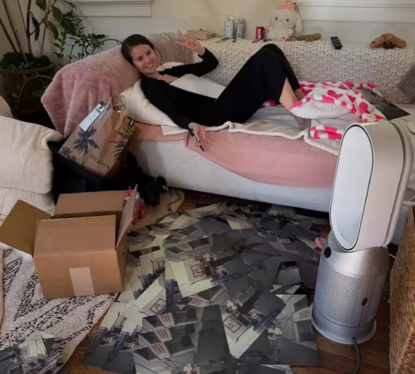 Alongside these star-studded scenes were softer, quieter images from home, including one that quickly became the focus of online discussion. In the photo, Gomez sits casually on her couch signing autographs, an ordinary moment that felt deliberately unguarded. However, fans with sharp eyes noticed a row of bottles on a windowsill behind her. Most appeared mundane, but one item stood out and soon became the subject of intense speculation and humor across platforms.